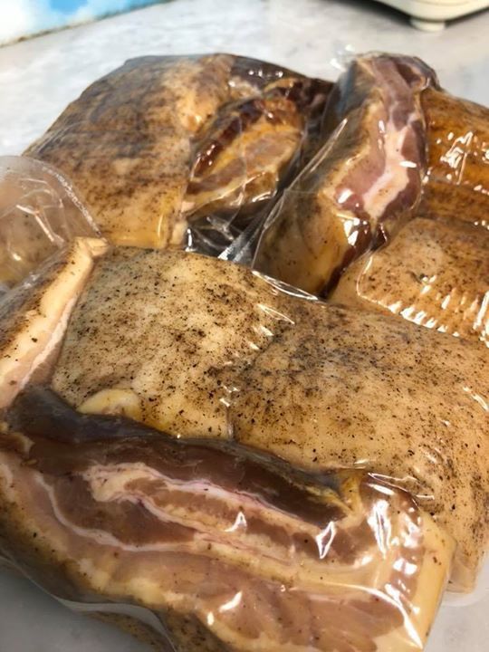 ほぼ万能に使える自家製ベーコン🥓今回の豚肉はオーストリア産のバラ肉です。4時間ほど燻煙して出来るベーコンは半生状態。熟成させてから真空パックします。売り出し出来るかも?来週には自家製のボイルハムも出来上がります。