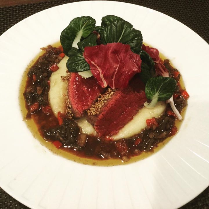 蝦夷ジカのステーキ。キハチ風に白胡麻を表面に付けてゆっくりレアに焼き上げます。ソースは色々なソースを合わせてオリエンタル風に!しっかりした量と味でジビエ料理として提供しています。ディナーメニューで提供していますが注文されればランチでも+料金でお出ししています。