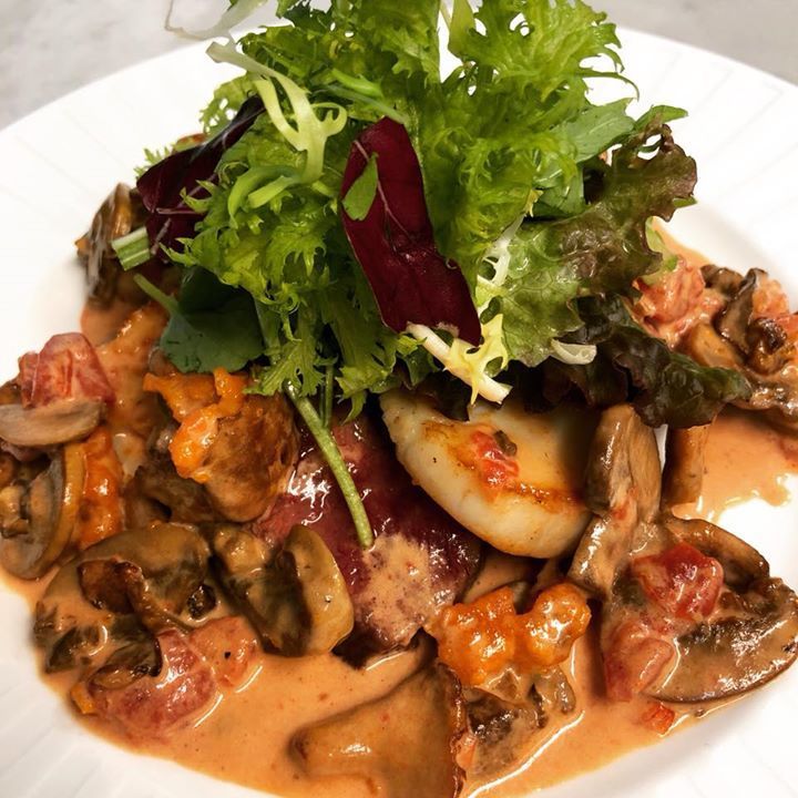 長野県産黒毛和牛もも肉のステーキと北海道産生帆立貝のポワレ フランス産キノコと生うにのクリームソース トマト風味 尊敬するフランス料理店のシェフのアドバイスを形にしてみました。この一皿で相当品のいい味と価格です。