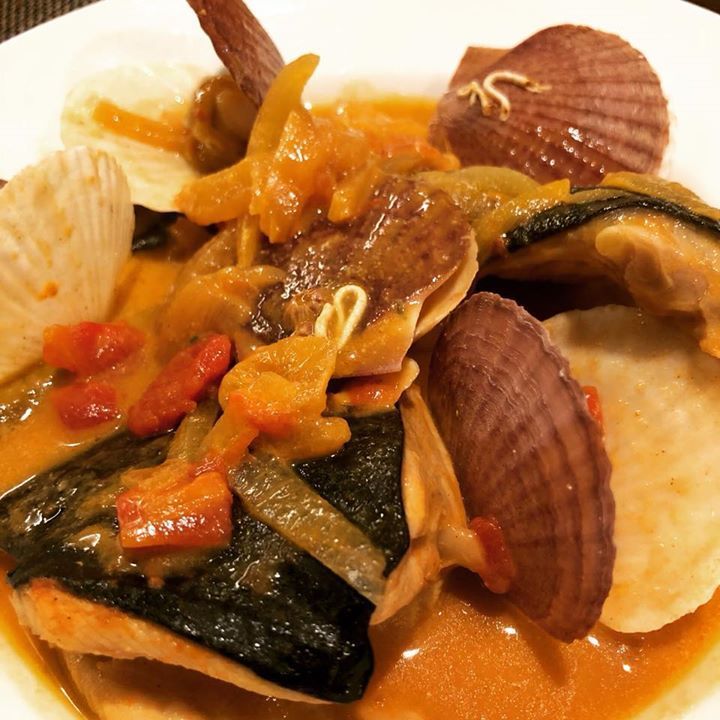 明日からの魚料理です🐟 エイとホタテを蟹や魚や鳥のフォンとワインと香辛料と合わせたブイヤベース風のスープで軽く煮込みます。エイは肉厚でボリュミーです。パンとワインに合いますよ🍷