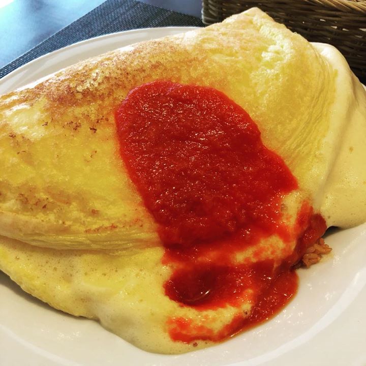 新しいオムライスを作りました。ディナーのメイン料理です。バターライスと自家製のハムをケチャップライスにして上にモンサンミッシェル風オムレツを乗せて自家製トマトソースをかけました。ディナーは単品でもコースでも召し上がってもらえます。