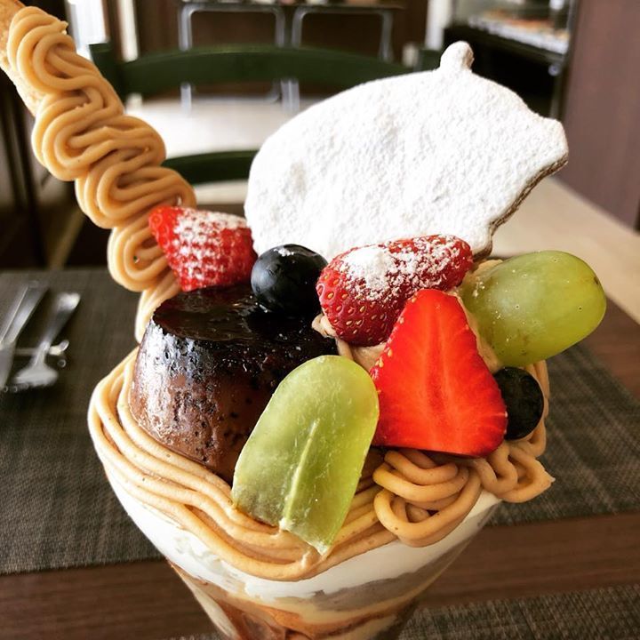 来週からのパフェです。バナナチョコレートを土台に栗のクリームとチョコレートプリン🍮🍫 季節のベリー類を中心にしたフルーツと日替わり3種類の自家製アイスクリームとシャーベット 豚さん🐖🐷のクッキーとシナモンシュガーをまぶしたパイ添えです。暑くなって来そうなのでフルーツたっぷりの季節のかき氷も出していく予定です。