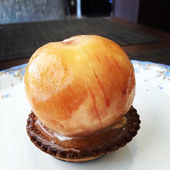 タルト ペーシュ 丸ごと1個の桃を乗せたタルト🥧🍑 中に岡崎おうはんの卵で作ったカスタードクリームを詰めてあります。販売個数は数量限定です。