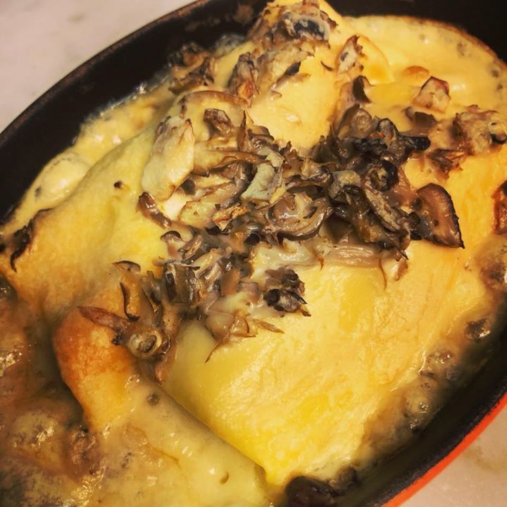 昨日は沢山の来店ありがとうございました。最後の方はバテバテでした。ランチのメイン料理の紹介です。クレープ生地で自家製ハムとマッシュルーム風味のクリームを包んでベシャメルソースをかけてグラタン仕立てにした料理 フィセル ピカルドです。お盆中は食材の仕入れが難しいものもあるので無くなる物も結構あります。今日も頑張ります。