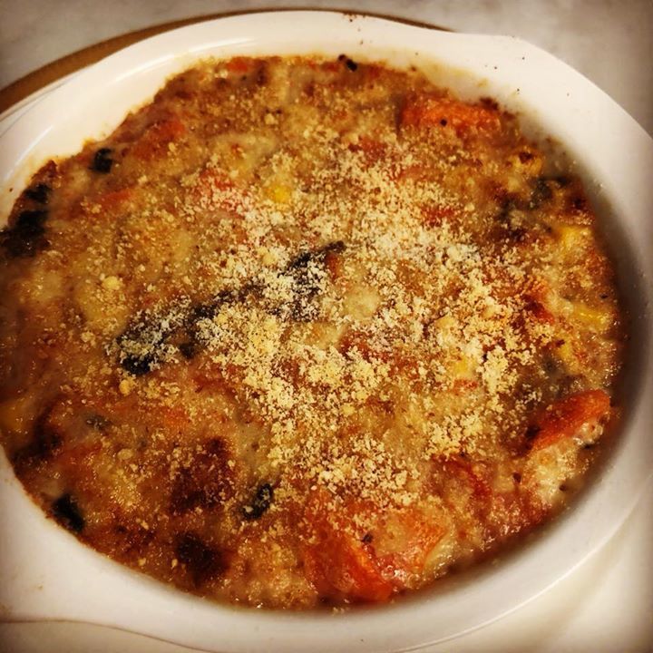 紅ズワイガニのドリア ベーコンとハムのターメリックライスの上に特製蟹クリームのグラタンソースを重ねてこんがり焼き上げます。ディナータイムのみの限定品です。コースでもアラカルトでも用意しています。